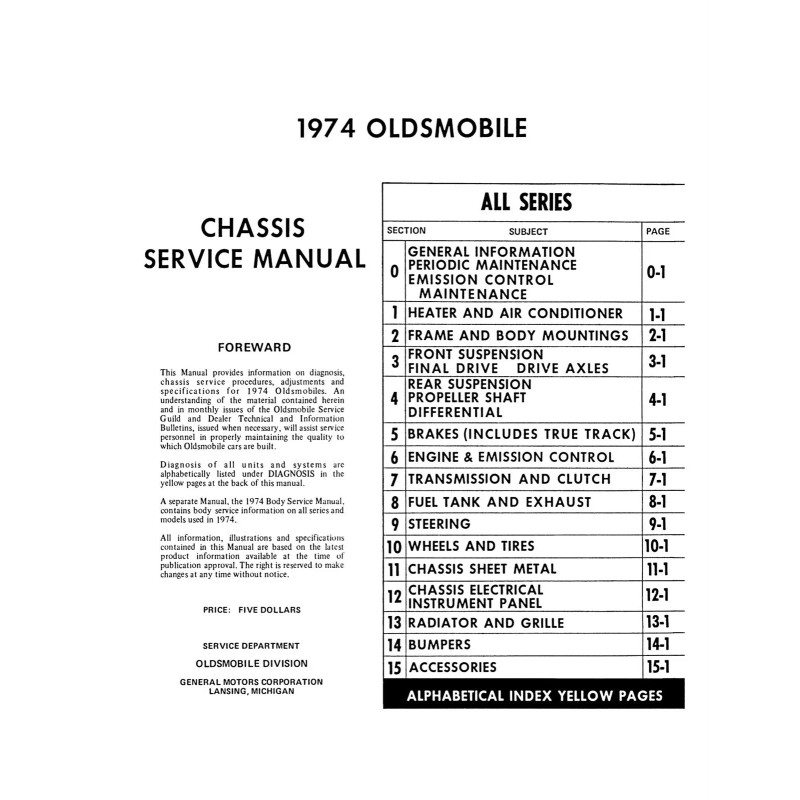 With the 1974 Oldsmobile Service Manual in your toolbox, you have the most comprehensive literature at your fingertips to take on the most challenging repair, service and restoration projects. This factory written Detroit Iron shop manual is perfect for the restorer or anyone working on one of these vehicles.