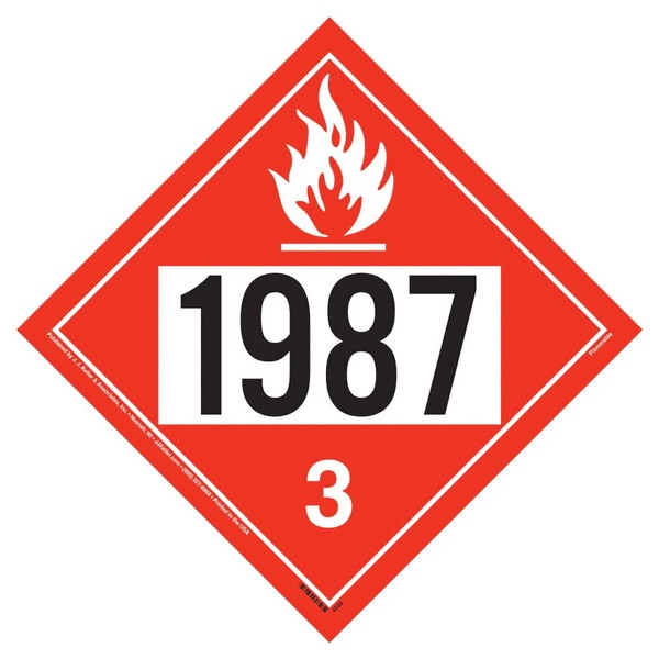 - Flammable liquid placards are pre-numbered with 4-digit identification number (UN 1987), hazard class (3) and DOT-required symbol.