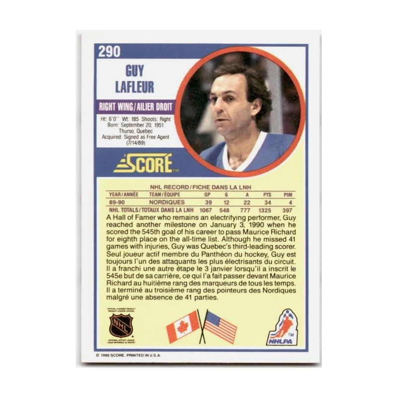 1990-91 Score Hockey Canadian Edition Guy Lafleur Nordiques Card #290 WN17