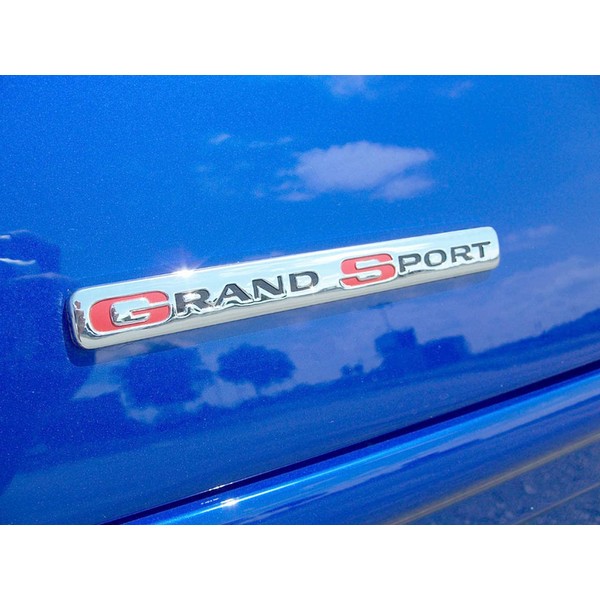 Highest quality, injection molded chrome plated plastic with embossed "GRAND SPORT" lettering in Red and Black indistinguishable from the original. Precisely sized at 5.5" x 9/16".
