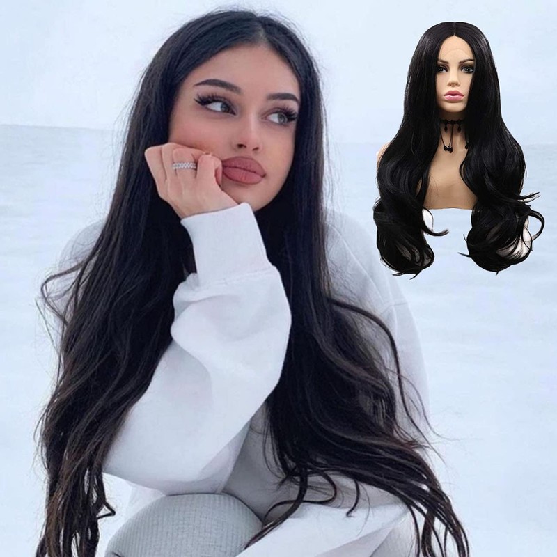1B Natural Black Long Curly Synthetic Hair Wigs for Women Realistic Looking Pure Black Hair Quality 24 Inch 150 Degree