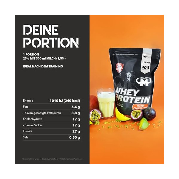 1kg Mammut Whey Protein Eiweißshake - Set inkl. Protein Shaker, Riegel, Powderbank oder Tasse (Mango Passion Fruit, Mammut Protein Bar - Raspberry)