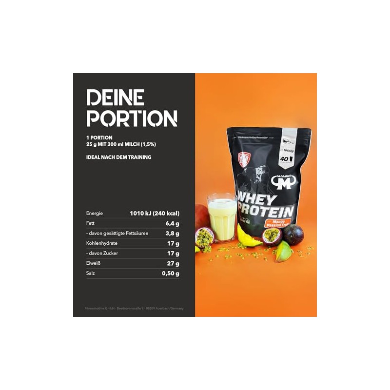 Mammut empfiehlt 25 g (2 gestrichene Dosierlöffel) Whey Protein mit 300 ml fettarmer Milch (1,5 %) zu mischen. Ein guter Zeitpunkt zur Aufnahme von Eiweiß ist direkt nach dem Training, denn speziell Krafttraining stimuliert die muskuläre Eiweißsynthese.