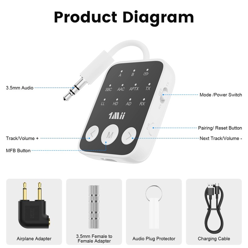 1Mii Bluetooth 5.3 Transmitter Receiver 2-in-1, aptX Adaptive & Low Latency Wireless Audio Adapter for Airplane, Dual Link 2 Devices, 25H Playtime, 3.5mm AUX for TV/Car/Home Stereo/Gym -White