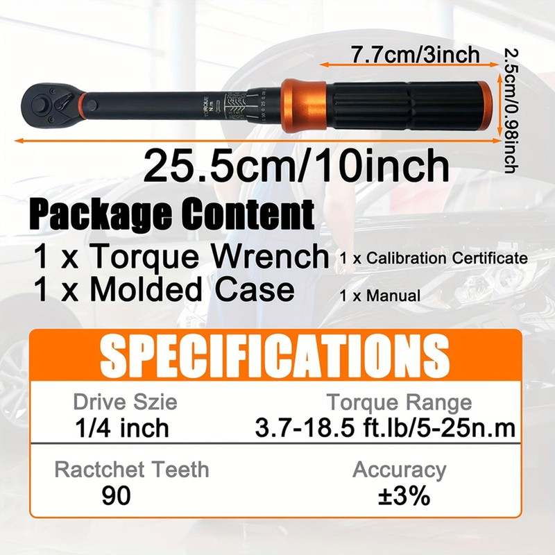 1pc 1/4" Drive Click Torque Wrench Set, 3.7-18.5 Ft-lbs / 5-25 Nm, Chrome Vanadium Steel, Adjustable Pneumatic Tool for Bicycle & Motorcycle Maintenance, Bicycle Tool, Adjustable Torque Wrench | Dura