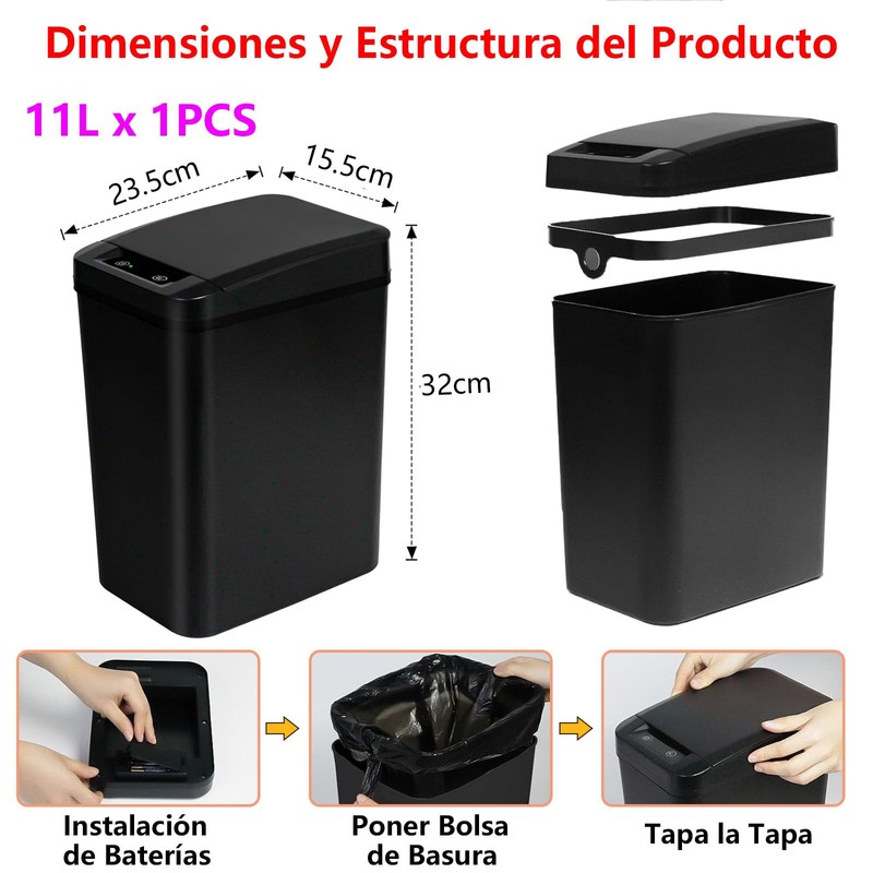 - 【Gran Capacidad 11L, Durabilidad】Incluye 1 pcs 11l cubos de basura. Los cubos automáticos de cocina están hechos de plástico ABS grueso, robusto y duradero, asegura una larga vida útil. Además, nuestro cubo de basura inteligente tiene una forma delgada ideal para espacios pequeños. Muy ahorro de electricidad. Cada papelera necesita pilas AA (No Incluidas). Además, nuestros botes de basura inteligentes tienen una vida útil más larga que los modelos de carga usb.