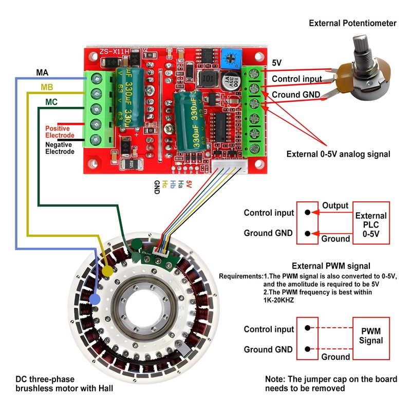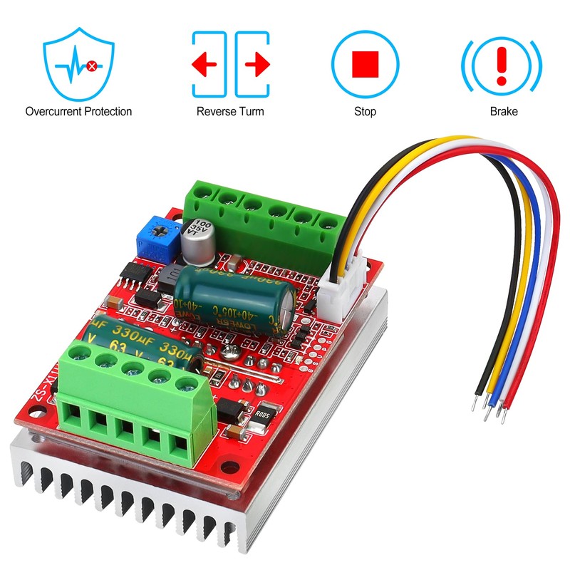 - Product Parameters: BLDC brushless control board wide voltage 6-60V, high power 400W, DC three-phase brushless hall controller, support for PLC 0-5V touch volume control, support for PWM control, amplitude 2.5-5V. This driver is only applicable to the electric angle of 120 degrees of DC brushless hall motor