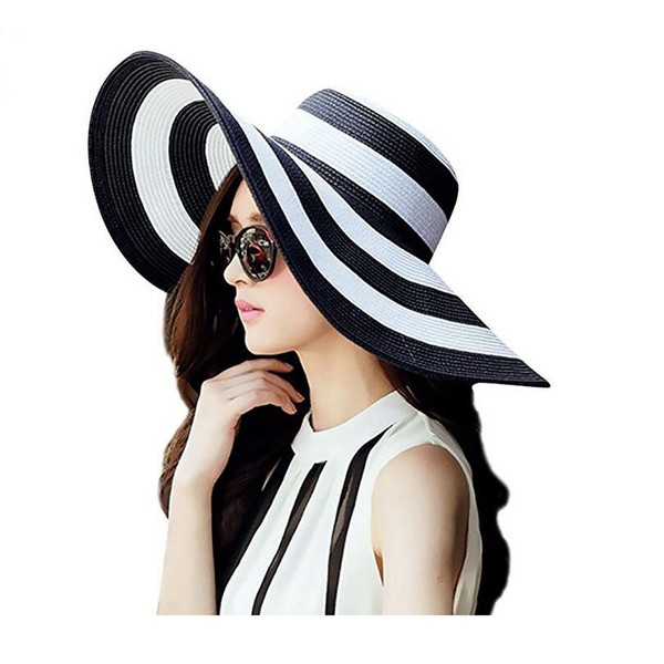 1Pcs Women Wide Brim Straw Hat Foldable Beach Floppy Sun Hat Black White Stripe
