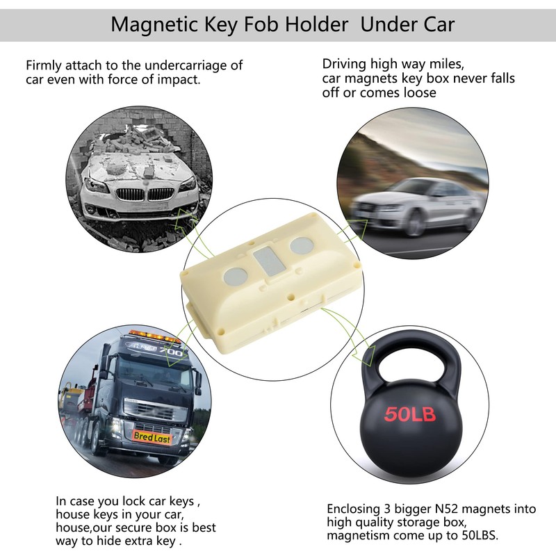 - Three N52 strong magnets are mounted in key case and The powerful magnet is embedded and molded into the plastic in order to never fall off or come loose.Magnetic key holder under car & outdoor withstands over separation force of 50 lbs.