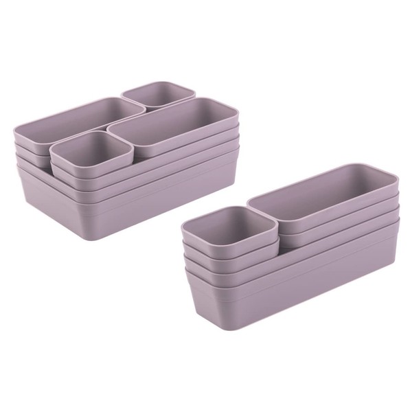 - Drawer organiser set (14 boxes, 4 different sizes) in lilac. Thanks to the individual arrangement, it is suitable for all standard drawers, chest of drawers, cupboards, etc.