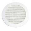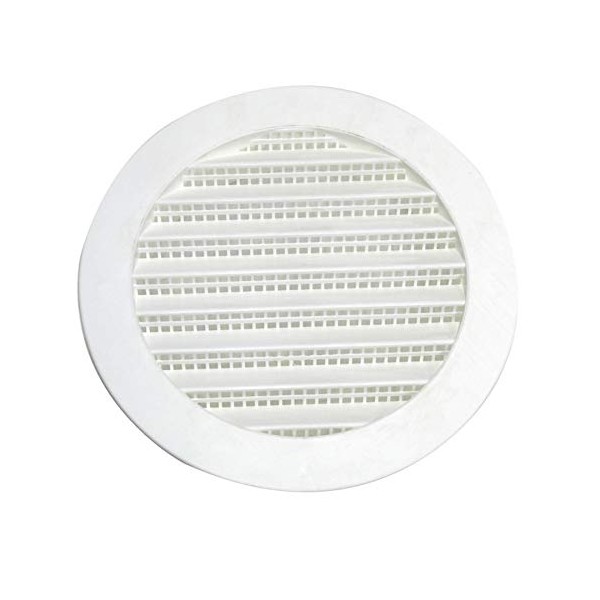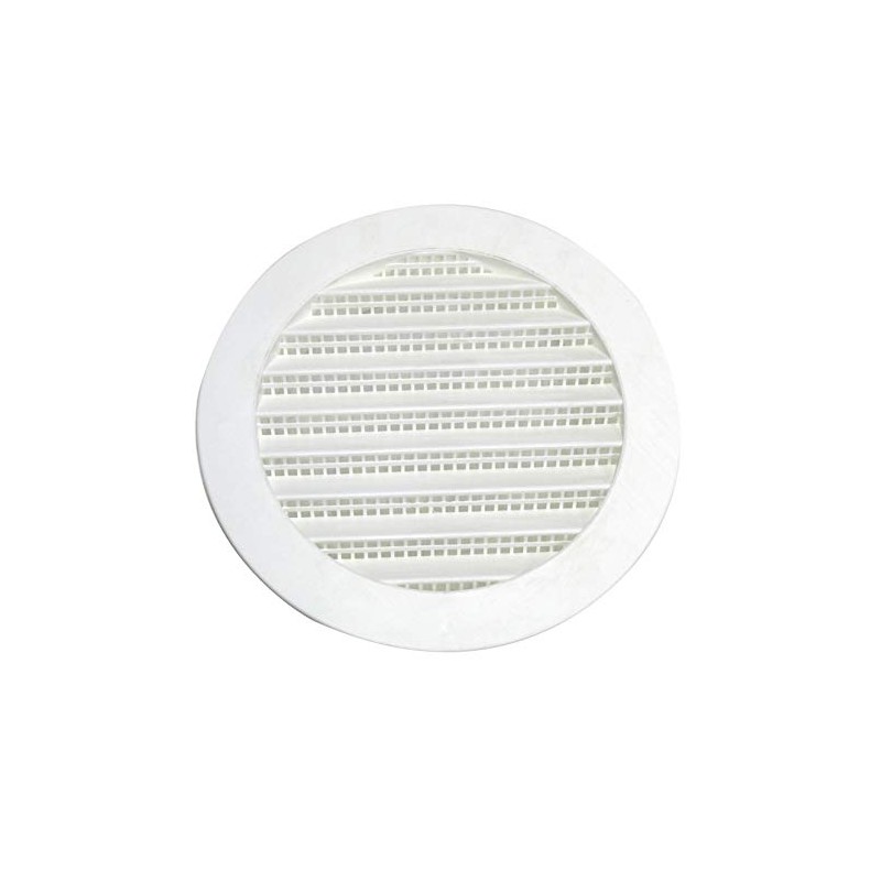 Round plastic mini louver installed to provide ventilation in soffits overhangs and the like. Molded grill to protect against the infiltration of pests and insects.