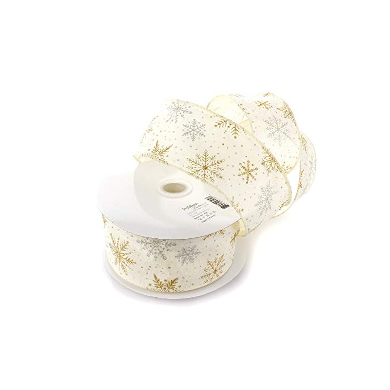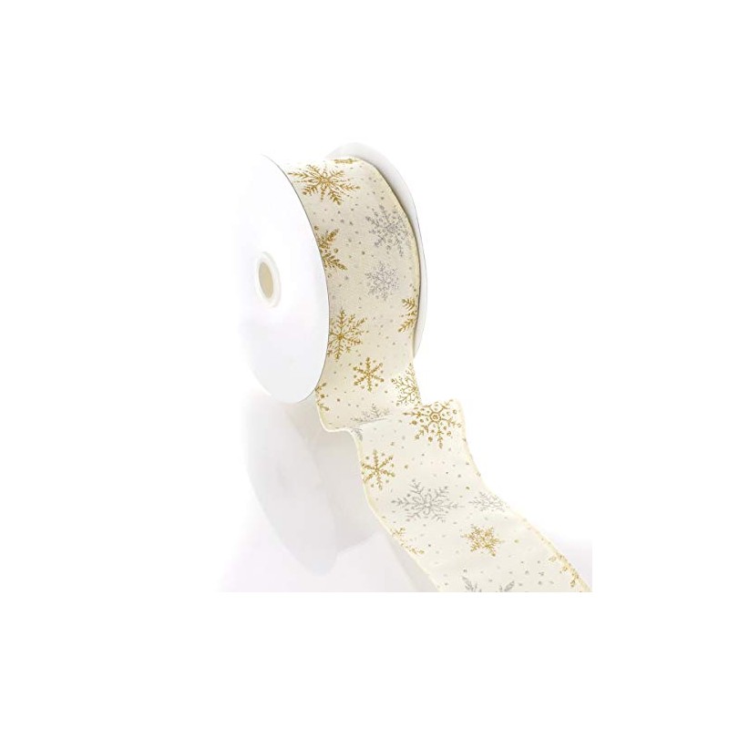 Constructed of a cream linen ribbon base with an elegant gold and silver glitter snowflake print design. This ribbon would make a beautiful addition to packaging gifts, floral arrangements, and winter and Christmas decor such as adding to garlands, trees, wreaths, etc.