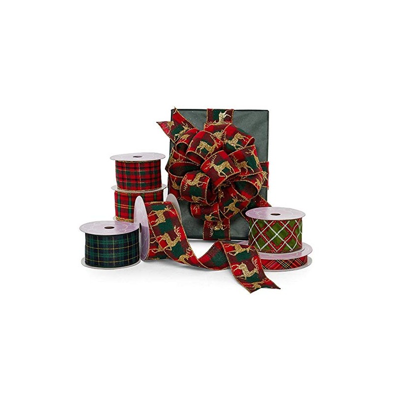 - Timeless plaid ribbon with gold trim and wire edges.