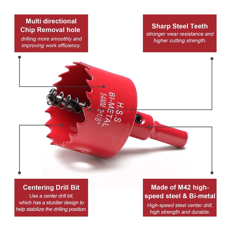 - EXCELLENT WORKMANSHIP: This 54 mm hole cutter is made of M42 high-speed steel and bi-metal, with higher hardness (≥65HRC), higher toughness, higher cutting strength, and stronger wear resistance. Also, Built rust-proof for repeat use. It’s cutting depth is 1.2 inch