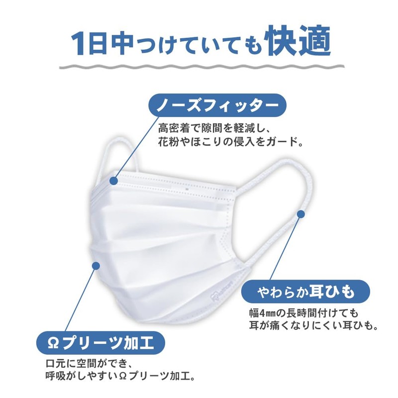 - 素材:[本体]ポリプロピレン[耳ひも]ポリエステル、ポリウレタン[ノーズフィッター]ポリエチレン