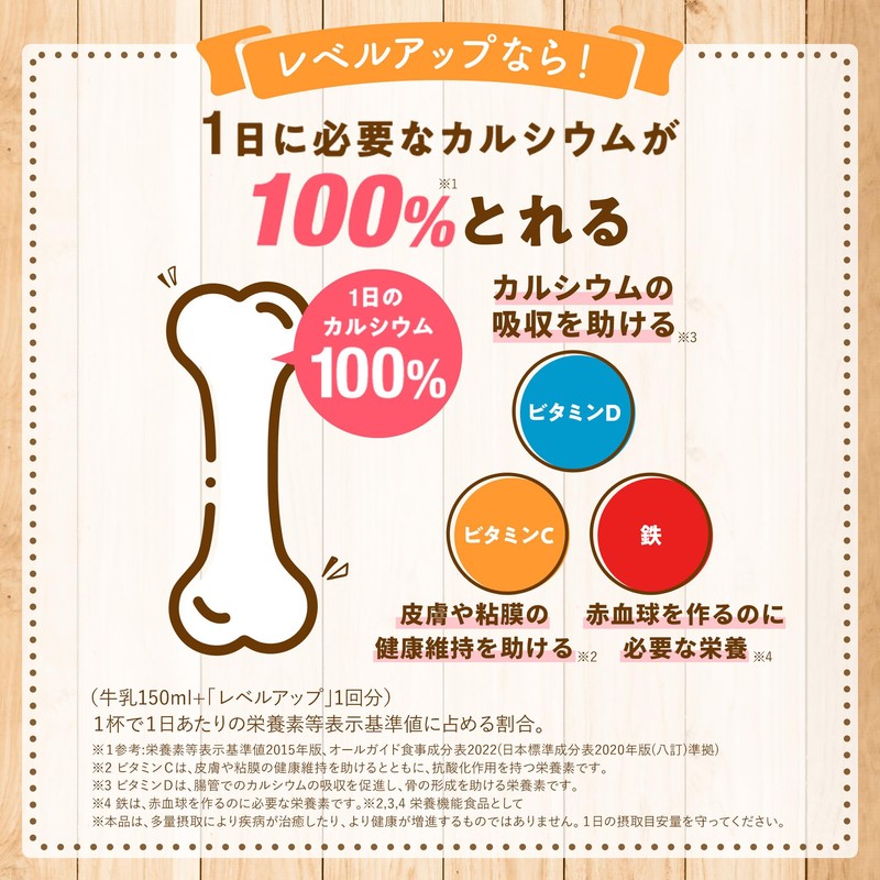 - ※1摂取目安量 ※2(牛乳150ml+ レベルアップ 1回分)1杯で1日あたりの栄養素等表示基準値に占める割合。参考:栄養素等表示基準値2015年版、オールガイド食品成分表 2017 (日本標準成分表2015年版(七訂)準拠)※3栄養機能食品として※4 ビタミンDは、腸管でのカルシウムの吸収を促進し、骨の形成を助ける栄養素です。※本品は、多量摂取により疾病が治癒したり、より健康が増進するものではありません。1日の摂取目安量を守ってください。