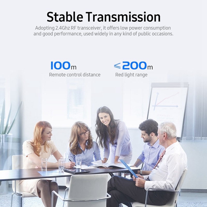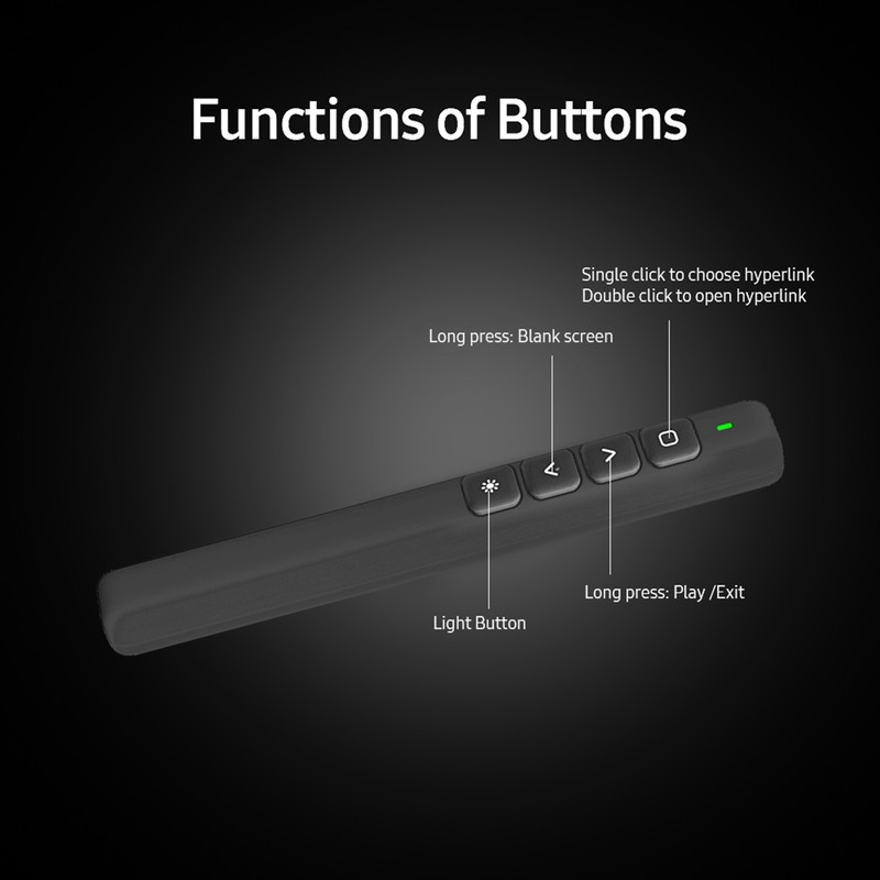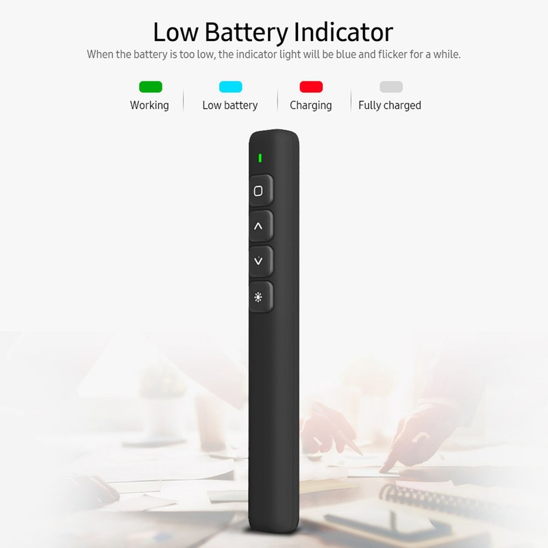1、Low Battery Indicator. When the battery is too low, the indicator light will be blue and flicker for a while. USB Receiver, Plug and Play. 2、Remote Control: 100m remote control distance, ≤200m red light range plus 360° control, enable you to give presentation at ease and no worry about distance. 3、Bright Red Light Pointer: A warm reminder for participants to catch each detail you speak. 4、Stable Transmission: Adopting 2.4Ghz RF transceiver, it offers low power consumption and good performance, used widely in any kind of public occasions. 5、Wide Compatibility: Compatible for Window xp, for Win 7/8/10, for iOS, for Android, and office series page turning format files.