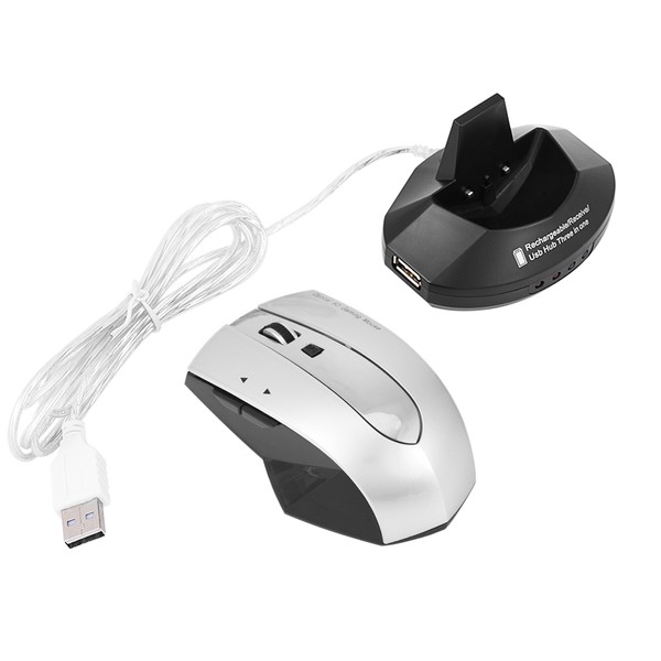 2.4GHz Rechargeable Wireless Optical Gaming Mouse w Charging Dock Stand USB Hub Black+Silver