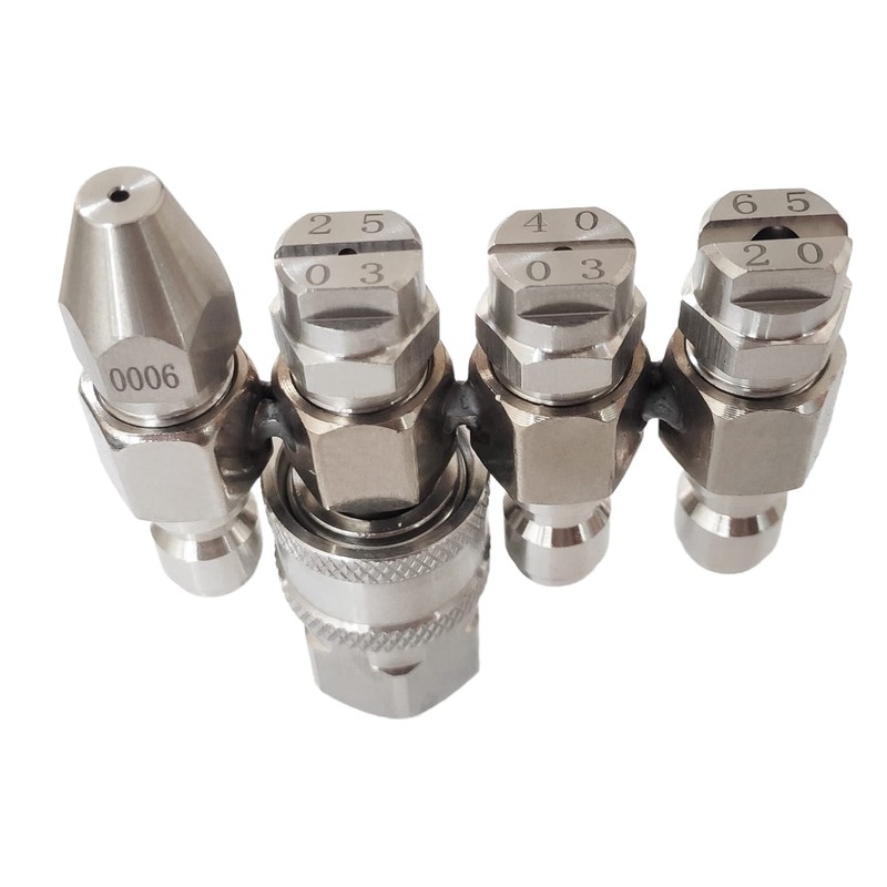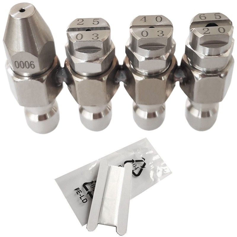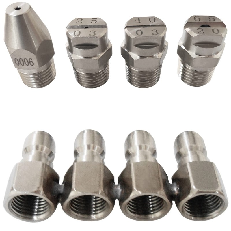 2. Nozzle Tips set includes 4 Multiple Degrees nozzle (0°, 25°, 40°, 65°): 1/4" 0006 (High Rinse-Sprays Straight Stream),1/4" 2503 (High Rinse- 25°),1/4" 4003(High Rinse- 40°),1/4" 6520 (Soap Mode- 65°).Choose different angles nozzle to wash.