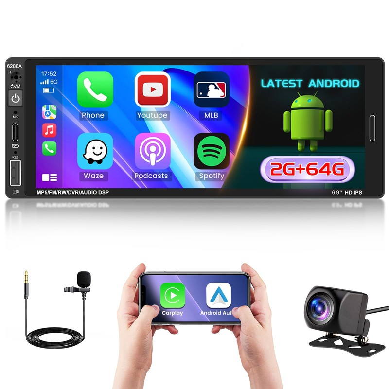 - 【6.9" Touchscreen Single Din Android Car Stereo】Apple CarPlay radio with Android OS, 2GB RAM+64GB ROM. Built-in GPS receiver, supports online and offline navigation functions. The 6.9-inch high-definition touchscreen has a resolution of 1248*480, providing you with a wonderful visual experience