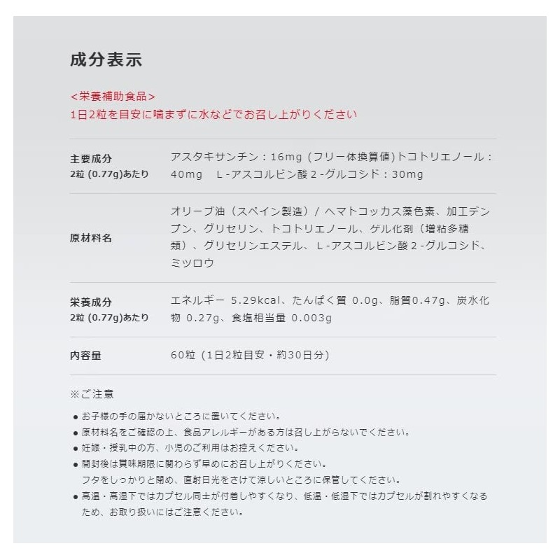 3つの主要成分 ●アスタキサンチン 自然界に広く分布するカロテノイドの一種の赤い色素。 さまざまな生物が生体防御に利用していることで知られ、体を守る力は天然成分の中でもトップクラスといわれています。 ●トコトリエノール ビタミンEを構成する成分の1つで、一般的なビタミンEのα-トコフェロールとは異なる働きでからだをサポートします。 併せて摂ることでアスタキサンチンの働きを強めます。 ●L-アスコルビン酸2-グルコシド 熱や光の影響を受けにくい、安定型ビタミンCです。 成分表示 ★1日2粒を目安に噛まずに水などでお召し上がりください 主要成分 2粒 (0.77g)あたりアスタキサンチン:16mg (フリー体換算値)トコトリエノール:40mg L-アスコルビン酸2-グルコシド:30mg 原材料名オリーブ油(スペイン製造)/ ヘマトコッカス藻色素、加工デンプン、グリセリン、トコトリエノール、ゲル化剤(増粘多糖類)、グリセリンエステル、L-アスコルビン酸2-グルコシド、ミツロウ 栄養成分 2粒 (0.77g)あたりエネルギー 5.29kcal、たんぱく質 0.0g、脂質0.47g、炭水化物 0.27g、食塩相当量 0.003g 内容量60粒 (1日2粒目安・約30日分)