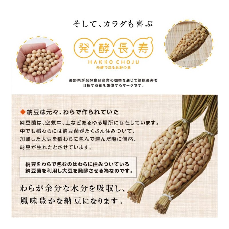 - 【素材のこだわり】素材は全て信州産を使用。「ナカセンナリ大豆」は甘みが強く、旨味が多いのが特徴です。納豆用に向いているといわれる大豆です。「稲わら」は集荷後すぐに回収、乾燥機で高温乾燥させた高品質な稲わらを使用しています。