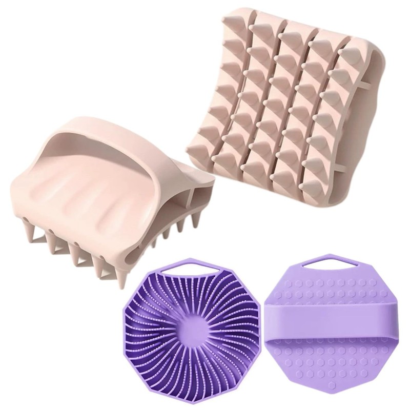 • [キット内容] ピンクのシリコン頭皮マッサージブラシと紫のシリコンボディブラシ、青いシリコン頭皮マッサージブラシと青いシリコンボディブラシ、緑のシリコン頭皮マッサージブラシと緑のシリコンボディブラシ、頭皮マッサージブラシ 8.5cm×8cm×7cm、ボディブラシ 10cm×10cm、2個パック