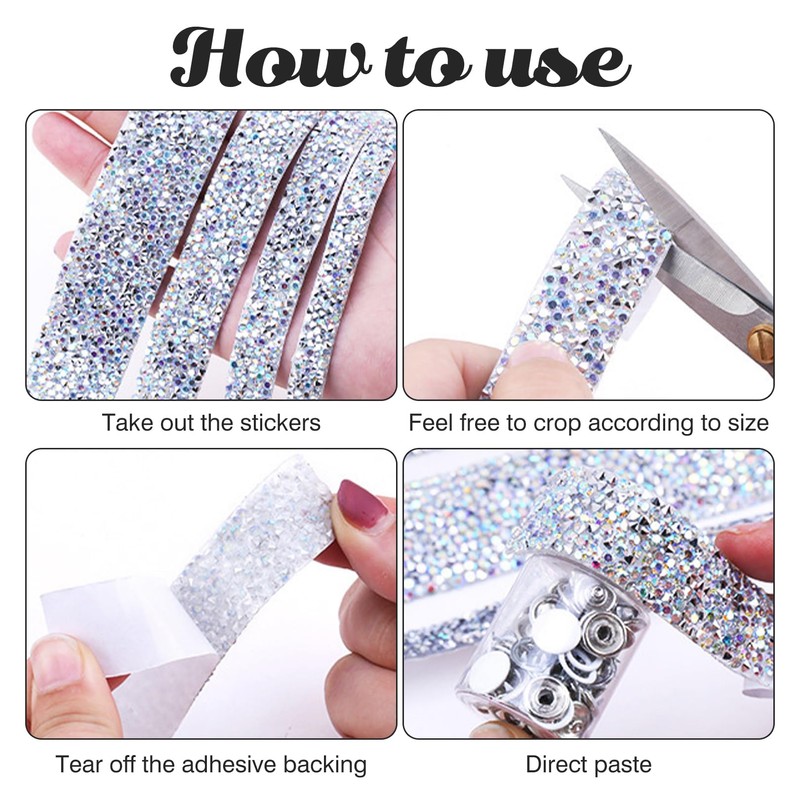 - Einfache Handhabung: Das selbstklebende Strassband ist sehr einfach zu verwenden. Sie können es zunächst mit einer Schere auf die gewünschte Größe zuschneiden. Wenn Sie es auf eine Oberfläche kleben möchten, können Sie entweder den unteren Aufkleber abziehen oder es mit einer Heizpresse oder einem Bügeleisen erhitzen. Dies spart im Vergleich zur individuellen Anbringung von Strasssteinen viel Zeit und Mühe.