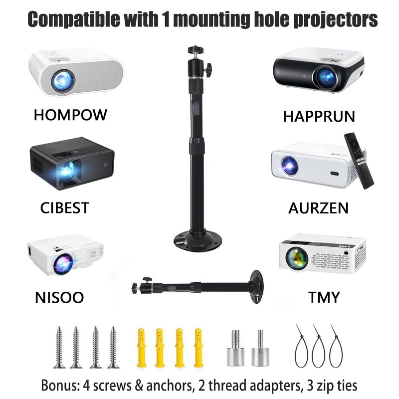 - 3.UNIVERSAL MOUNTING-Universal Mini Projector Mount is for almost all projectors with 3 sizes of screw diameters, 0.153/0.232/0.25in (3.9/5.9/6.35mm). Upgrade the surface of the thread adapter to increase friction and make installation easier.