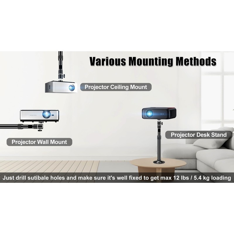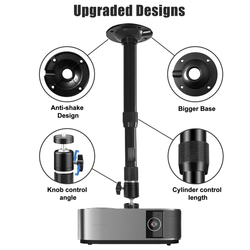 - 5.GREAT FOR PROJECTION-The video projector mount is designed for wall or ceiling with Anti-shake Design and Reinforced Base with a loading capacity about 12lbs /5.4kg. Eligible for almost all projectors, mini projectors, cameras with one mounting hole.