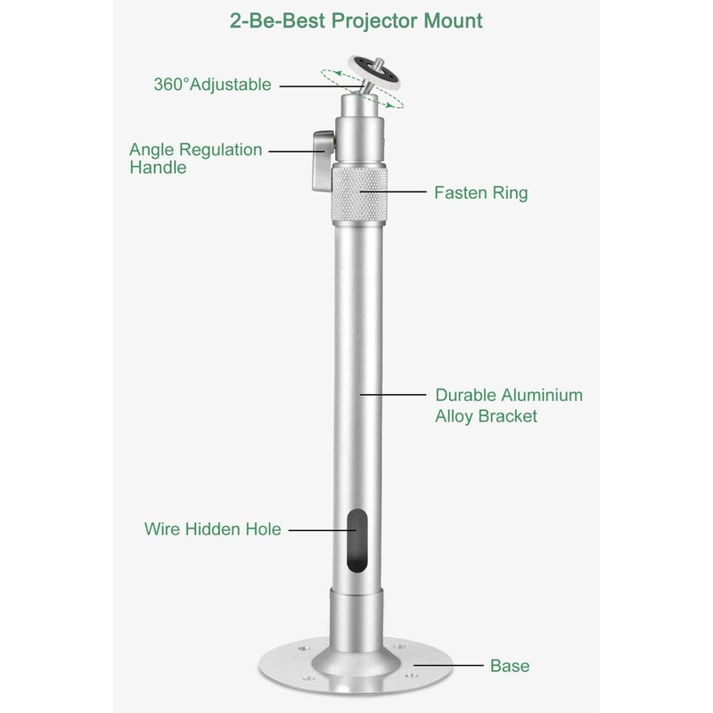 - 360° ROTATABLE HEAD: The adjustable projector mount has a 360° horizontal rotation and 90° vertical rotation head. With a Upgraded Easy-fixed Handle, you can fix best angle you need well. Just swivel your projector and fix the little handle.