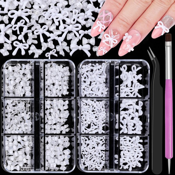 2 Boxes 3D Bow Nail Charms, White Mini Bow Charms Transparent/Solid Resin Bow with Pickup Tools for Women Nail Decorations DIY Craft