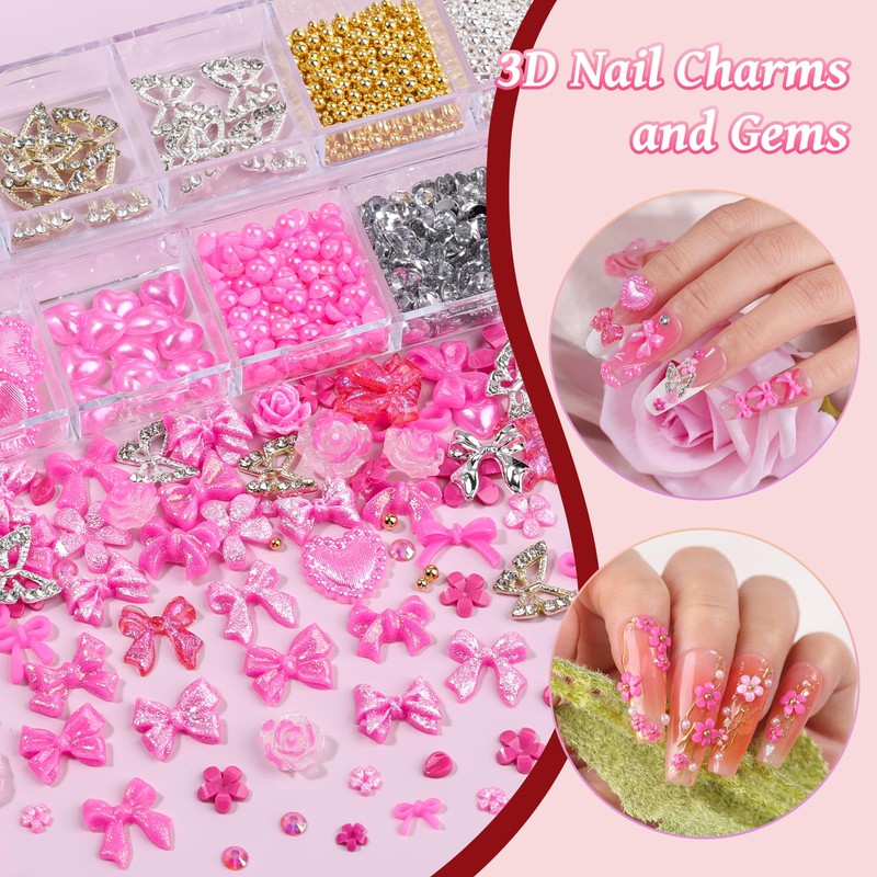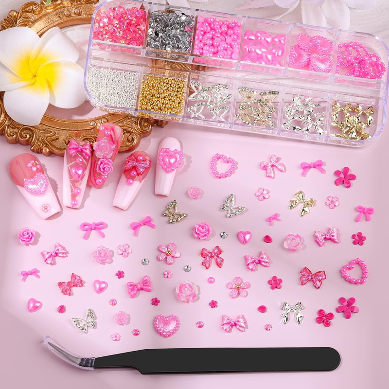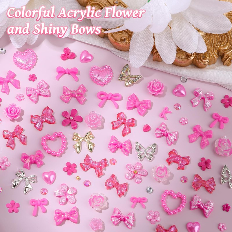 2 Boxes 3D Nail Charms Set,Nail Bows Charms and Small Flowers,3D Flowers for Nails with Rose,Petals,Caviar Beads,Flatback Crystals,Pearls,Y2K Alloy Butterfly Bow with Tweezers for Nail DIY (Hot Pink)