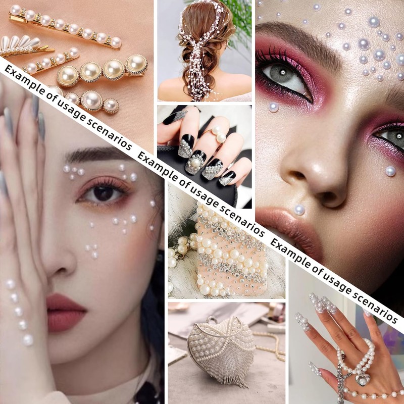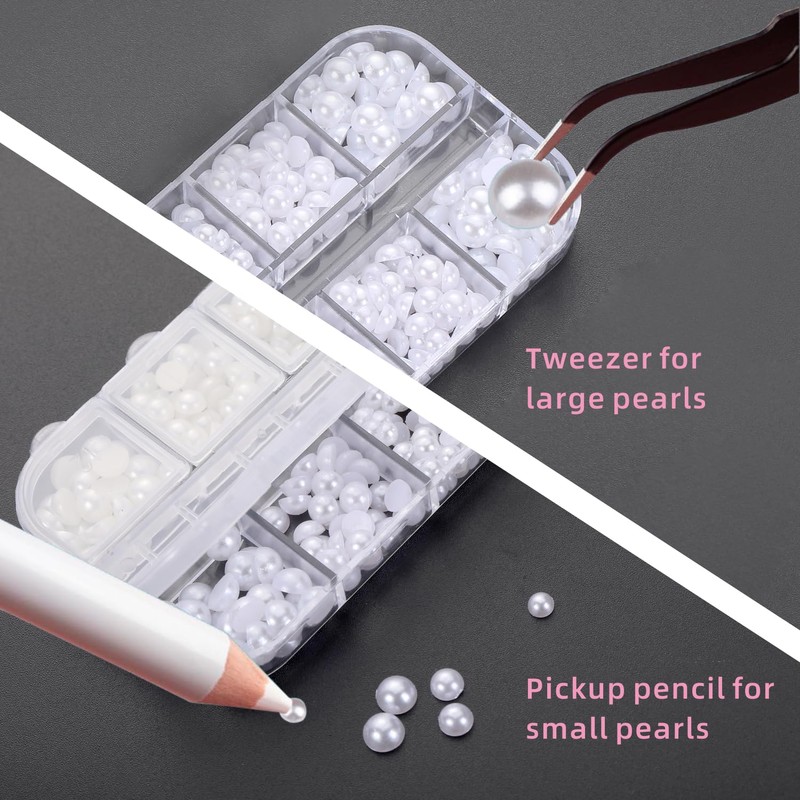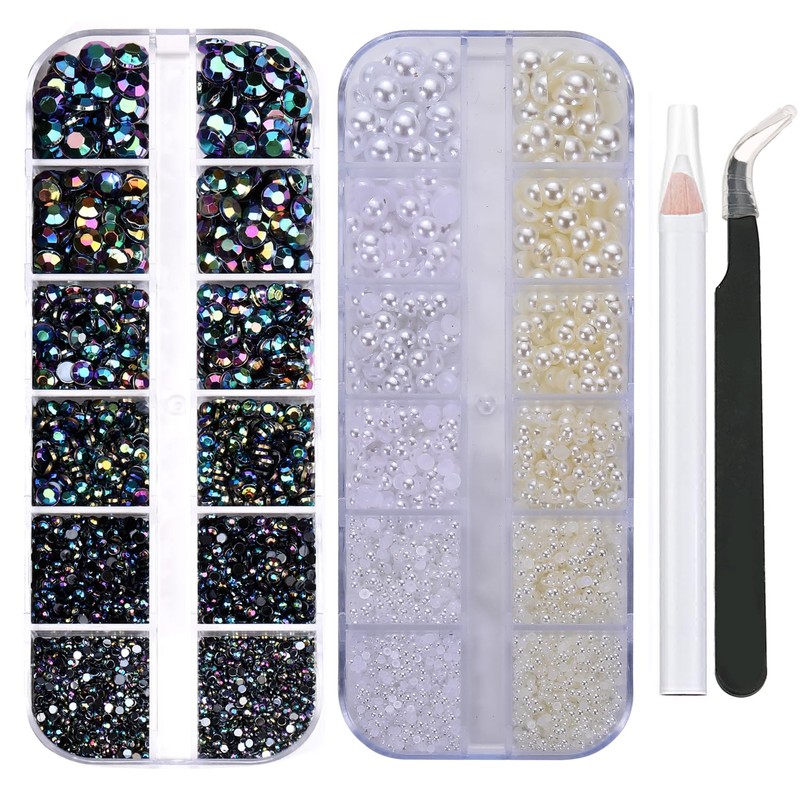 - 2 Boxes Flat Back Rhinestone&Pearls Kits for Nail Art, Face Makeup and Craft,Flatback Half Round Pearls White and Beige Color+ Black AB Crystal with Pickup Pencil and Tweezer