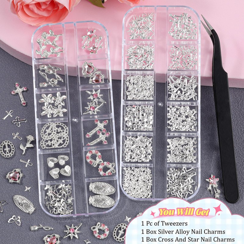 - 【Exquisite Silver Charms Nail Accessories】You will receive 2 boxes of 24 styles silver charms for nails, including silver crosses, silver stars, silver heart-shaped gemstone accents, silver roses, and Virgin Mary designs. These exquisite silver nail decorations can be freely mixed and matched, perfectly suited for DIY nail art and craft projects.