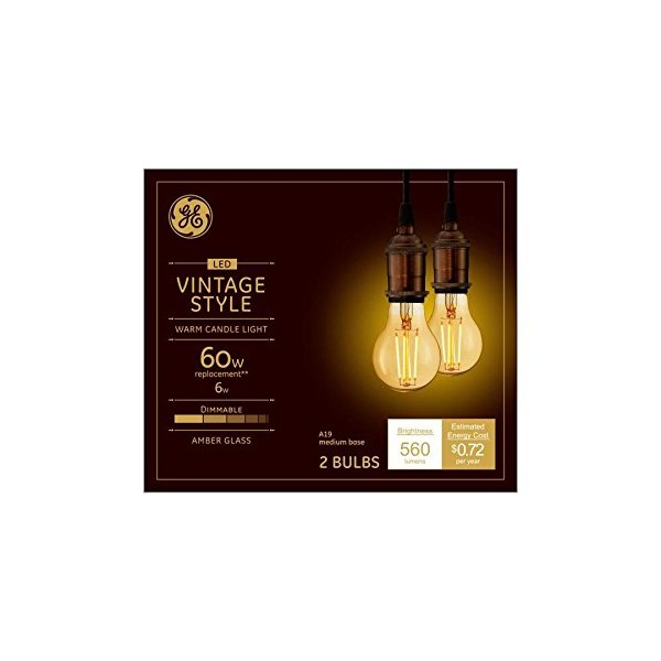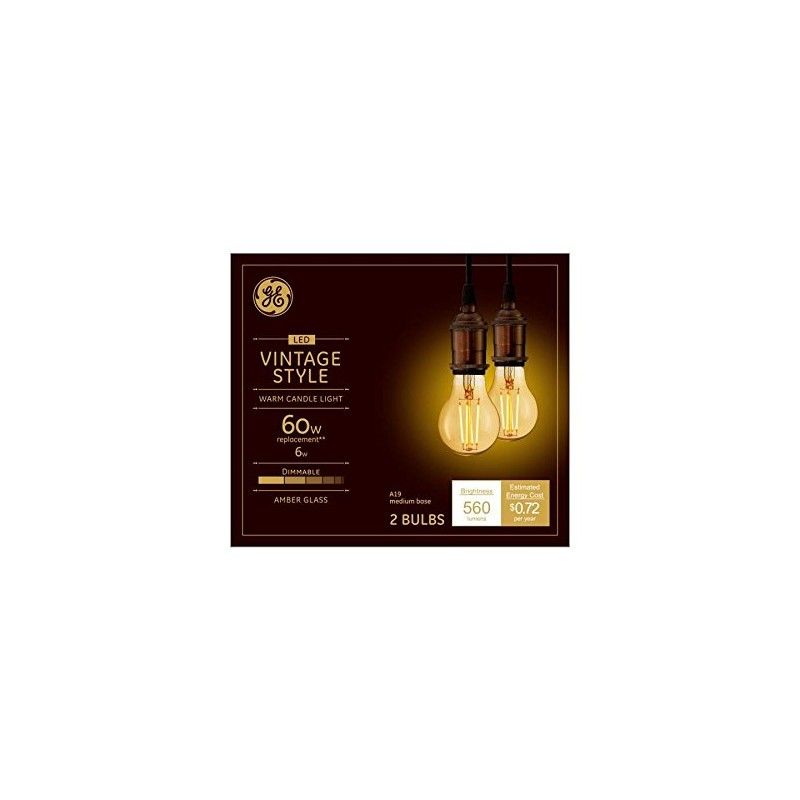 (2 bulbs) GE 48556 Vintage Style, Amber Glass A19 LED Light Bulb, 60 watt equivalent, 560 lumens, medium base, Dimmable