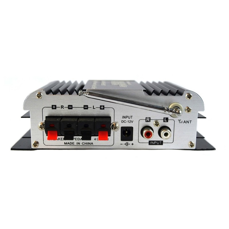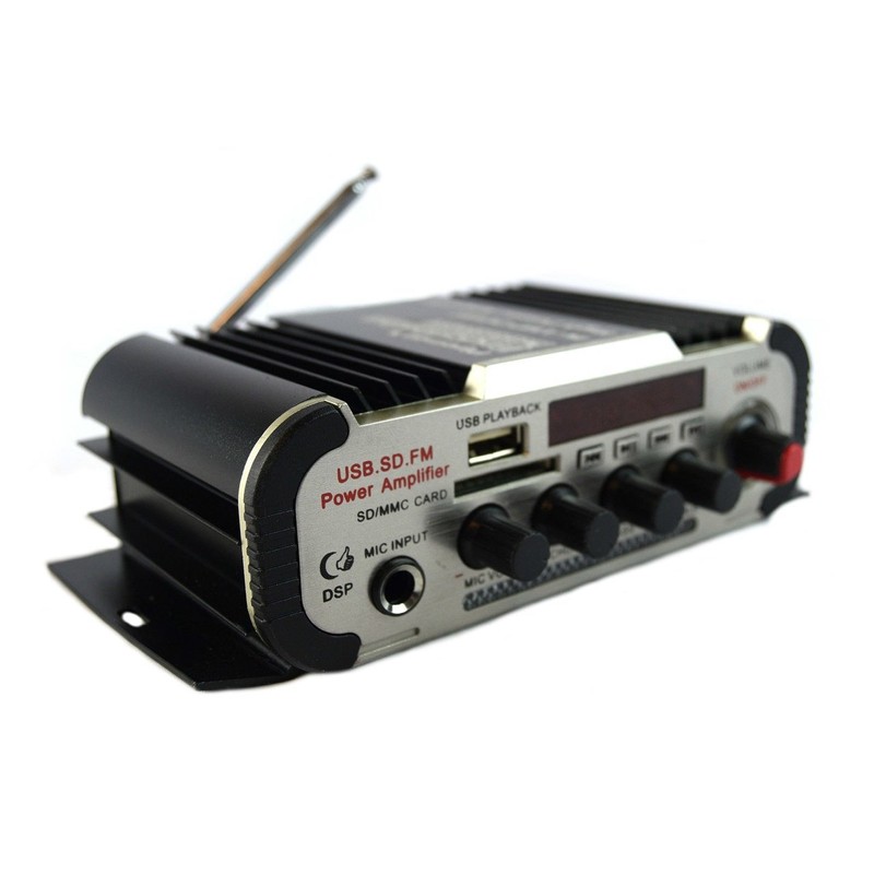 - USB, SD card input, FM Stereo radio. MP3 audio format play. External audio input. DC 12V input.