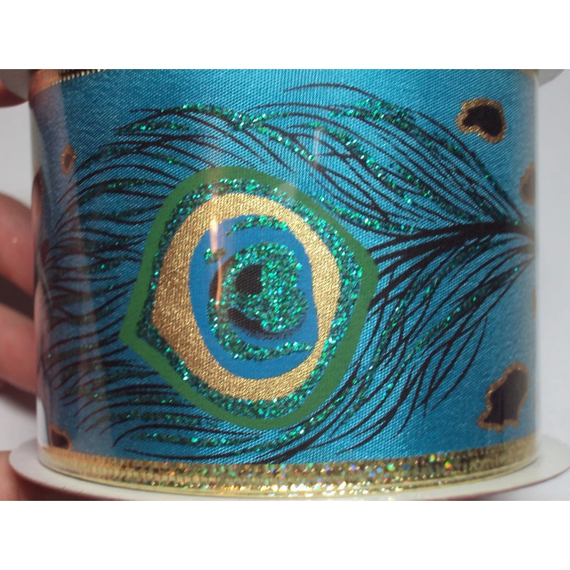 (2) Christmas Wired Ribbon Peacock Feathers Blue Gold Glitter 30 ft, NEW