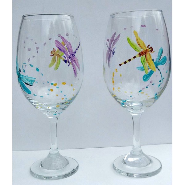 2 Dragonfly Multi Color Hand Painted Wine Glasses