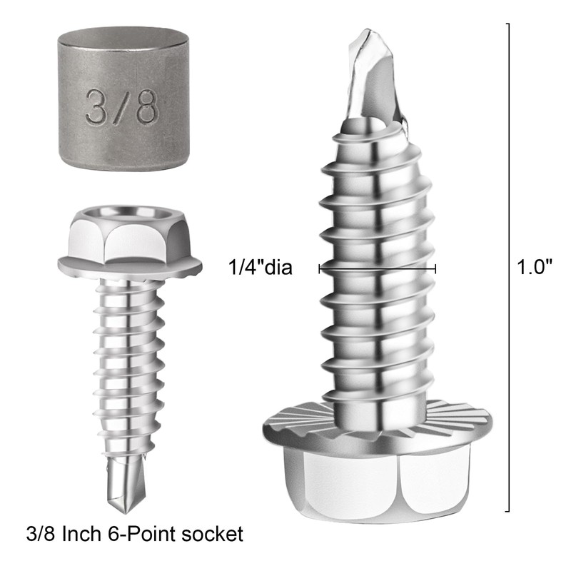 - 【Product Size】 These self tapping screws have a total length of 1", with a bolt length of 0.9" and 1/4" diameter. Designed to work perfectly with a 3/8 socket, they are compatible with any standard socket set, providing ease and convenience.