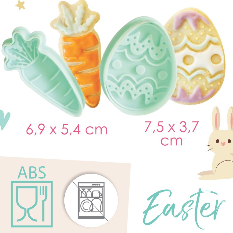 - Perfect for Easter celebrations, with these cookie cutters you can add a touch of originality to your sugar paste, cookies and much more. Thanks to the integrated ejection mechanism, releasing the mould is easy and effortless.