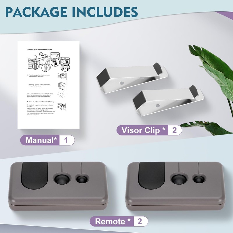 Package includes garage door opener remote * 2, sunshade clip * 2, manual * 2. Each remote come with a visitor clip, so you can easily attach it to your car's visitor and control your garage door while driving.