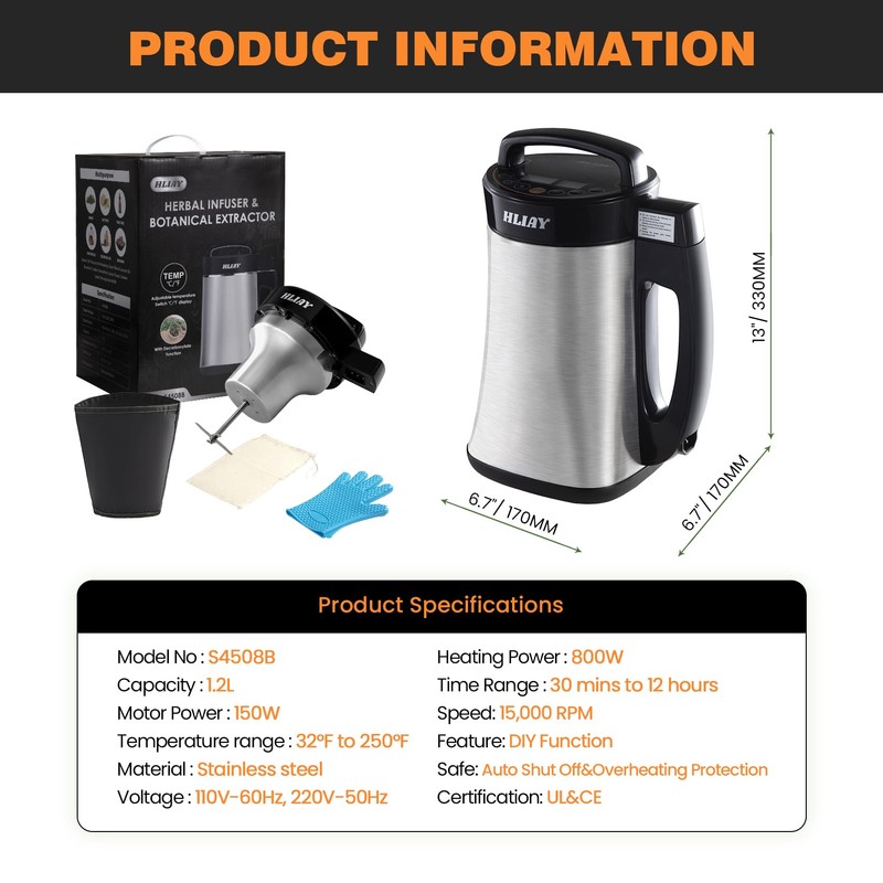 Make Delicious Edibles at Home: Our weed infuser machine includes six preset functions: ①BUTTER ②OIL ③TINCTURE ④NO HEATING ⑤DECARBOXYLATE ⑥CLEAN. With the push of a button, effortlessly create perfectly infused butters, oils, and tinctures for all your favorite recipes. Plus, cleanup is a breeze thanks to the automatic cleaning cycle.