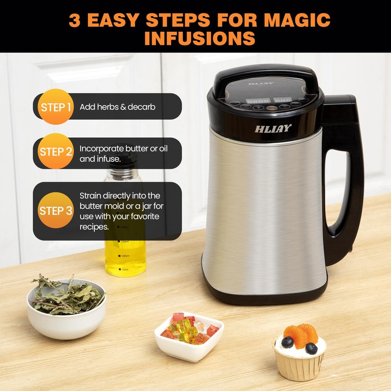 - Make Delicious Edibles at Home: Our weed infuser machine includes six preset functions: ①BUTTER ②OIL ③TINCTURE ④NO HEATING ⑤DECARBOXYLATE ⑥CLEAN. With the push of a button, effortlessly create perfectly infused butters, oils, and tinctures for all your favorite recipes. Plus, cleanup is a breeze thanks to the automatic cleaning cycle.