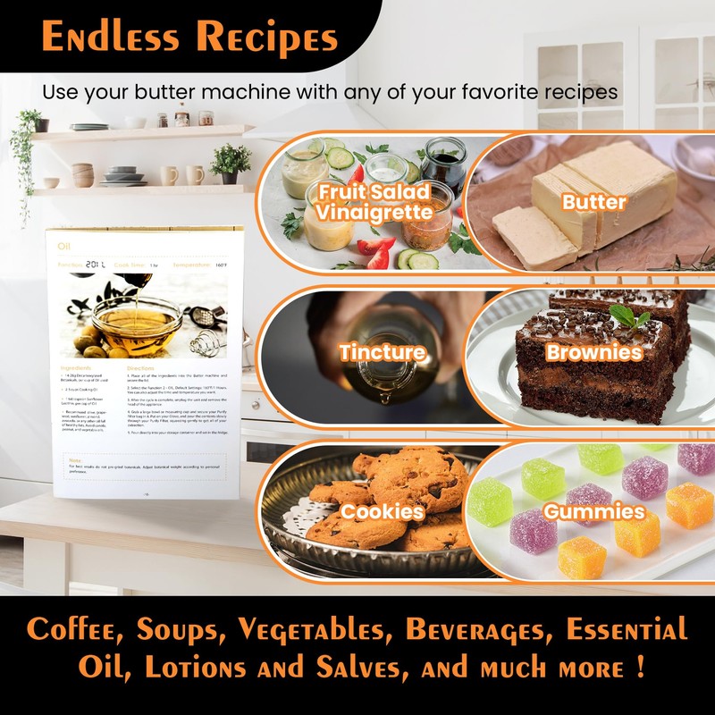 - Include: Our weed infuser machine is made with food-grade 304 double layer stainless steel and comes with 2 nylon filter bags, Silicone Gloves, a comprehensive recipe book, and full-color illustrated instructions. Additionally, the butter Infuser machine includes a recipe section featuring around 10 infusion recipes, tips, and suggestions. You'll find recipes for weed, herbal, butter, oils, tinctures, fruit salad vinaigrette, milkshakes, and more, along with helpful tips and techniques.