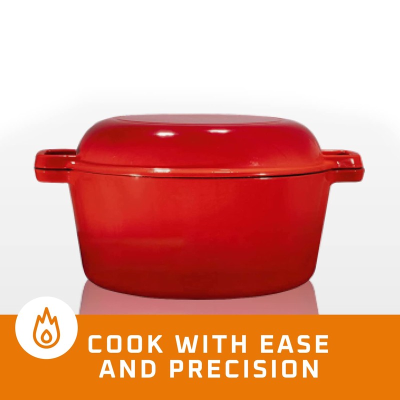 - 5-quart heavy duty cast iron dutch oven and casserole with a lid that doubles down as a skillet