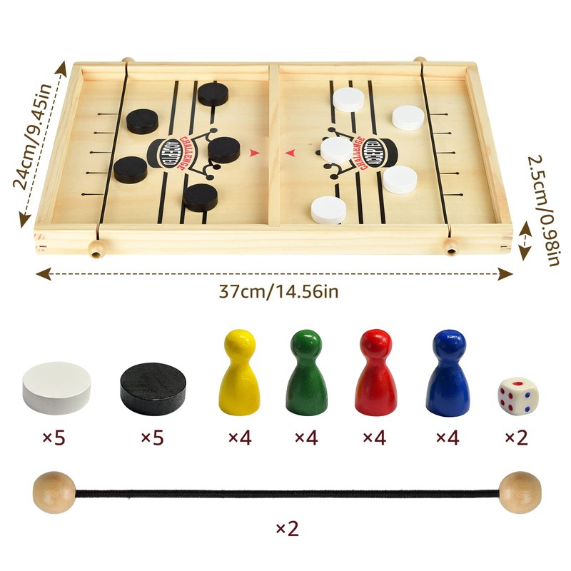 - 【2 in 1 Board Game】On one side of the chessboard is the fast sling puck game, which can be completed within 5 minutes, making players feel excited by adrenaline going. The other side is ludo game, which is a strategy game that takes more than 15 minutes to complete.