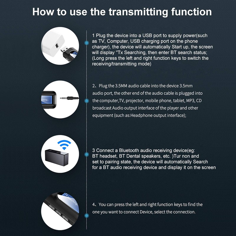 - Transmitter mode: Wirelessly transmits o from a non-BT TV, home stereo system or CD player to a BT headset or speaker; Receiver mode: Wirelessly transfer o from a BT-enabled phone, tablet or computer to wired speakers or headphones.