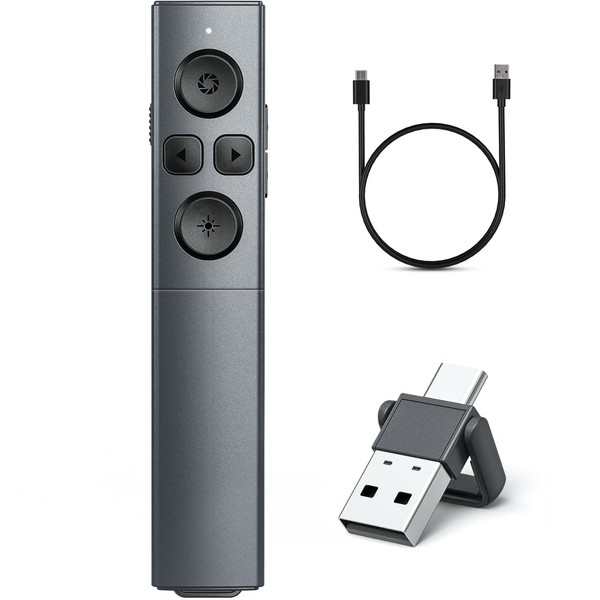 - 【2-IN-1 USB TYPE C, PLUG & PLAY】This wireless presenter compatibility with both usb type c and traditional usb ports makes it versatile and convenient. The clicker is easy to use and highly responsive, ensuring that you can navigate through your slides with ease. Just plug into the wireless receiver usb, no need to install software. This 2-in-1 usb type c presentation clicker is an excellent tool for any presenter who wants to deliver seamless and flawless presentations.
