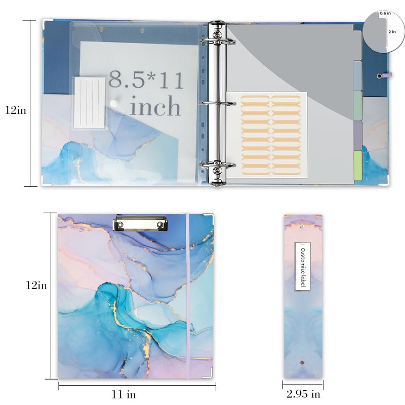 2 Inch 3 Ring Binder Organizer with Clipboard, 5-Tab Pockets Dividers, Transparent Folder, 18 Divider Stikers, BVSSX Decorative Three Ring Binder with Pen Loop, Elastic Strap (Blue Marble,Letter Size)